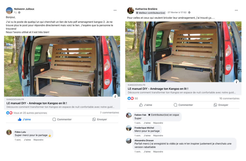 Je recommande vivement le manuel DIY pour aménager votre Kangoo en un lit pratique, économique et facile à réaliser. Grâce à leur guide clair et détaillé, j’ai pu transformer mon véhicule en un espace confortable pour dormir lors de mes road trips. Le support client est également très réactif et à l’écoute. Une solution idéale pour les amateurs de voyage autonome !